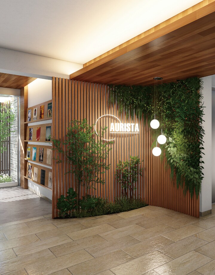 住まいのエントランスには、 AURA(輝き)+STAR(星)の館名ロゴをシンボルに 木目調の温かみのあるデザインを配し、 ご入居者やゲストをやさしく出迎えます。
