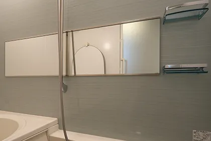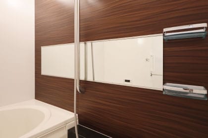 バスルームに設置された横長のミラーで、広く開放感のある空間を演出します。