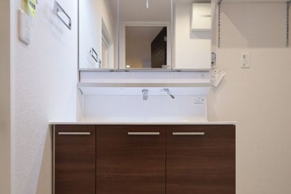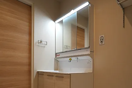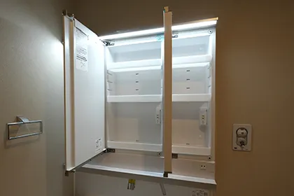 三面鏡の裏側には収納棚を確保。スキンケア用品やヘアケア用品などをすっきり整理できます。