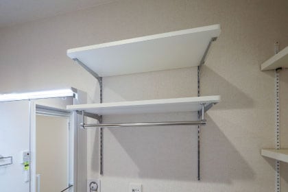 タオルや洗剤の収納に便利な吊戸棚の下にも、ハンガーがかけられるスペースを確保。