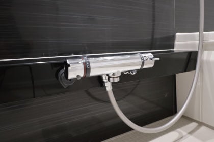 温調ハンドルで温度を設定すれば、お湯が熱くなったり冷たくなったりせず、安定した温度のお湯が得られます。