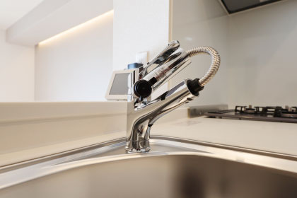 シンクの隅々までしっかり洗える浄水機能付き引き出しシャワー水栓。
