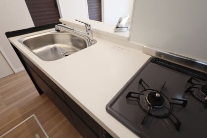 お手入れしやすく、見た目にも美しいハイパーガラスコートトップ3口ガスコンロを採用しています。