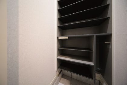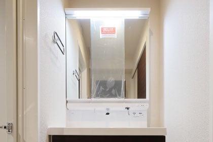 三面鏡の裏側には収納棚を確保。スキンケア用品やヘアケア用品などをすっきり整理できます。