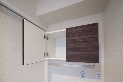 タオルや洗剤の収納に便利な吊戸棚の下にも、ハンガーがかけられるスペースを確保。