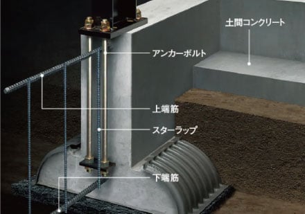 柱と基礎の接合部には、高強度のSS490鋼を使用し、M24のアンカーボルトで固定して耐震性を高めています。