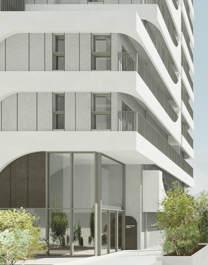 白を基調とした都会的な色調と、バルコニーにR形状を取り入れた都会的でシンプルなデザイン性を持ちつつも、文京の地に溶け込む落ち着きある構成。