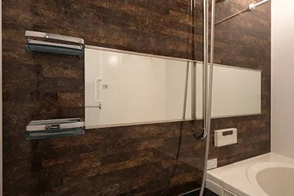バスルームに設置された横長のミラーで、広く開放感のある空間を演出します。