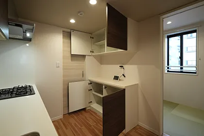 キッチンの収納力を高めるカップボードが標準装備されています。