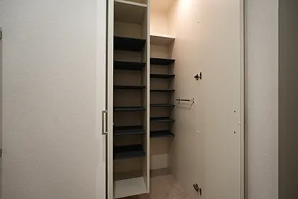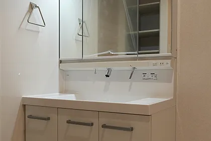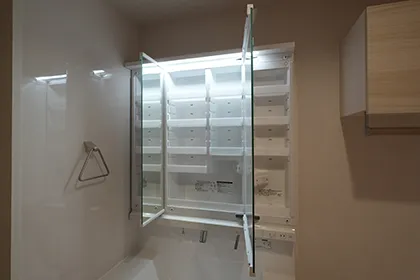 三面鏡の裏側には収納棚を確保。スキンケア用品やヘアケア用品などをすっきり整理できます。