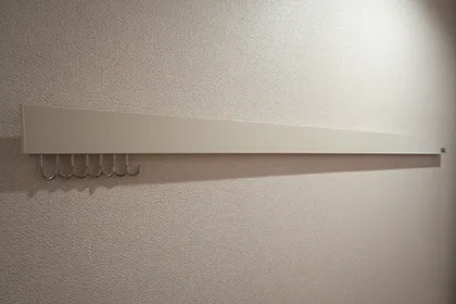 タオルや洗剤の収納に便利な吊戸棚の下にも、ハンガーがかけられるスペースを確保。