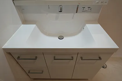 継ぎ目のない美しさと小物が置ける、カウンター一体型のボウル。お手入れのしやすいスクエアタイプを採用。