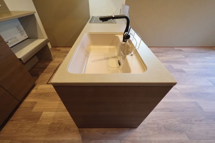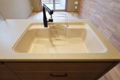 シンプルなデザインでシンク内も美しさを保つ人造大理石を採用。簡単なお手入れでキレイを保てます。
