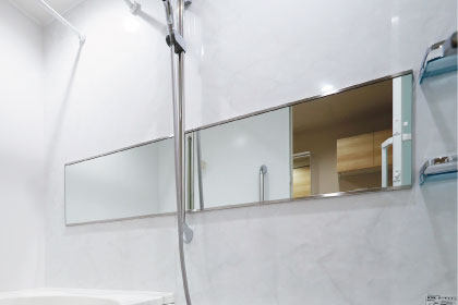 バスルームに設置された横長のミラーで、広く開放感のある空間を演出します。