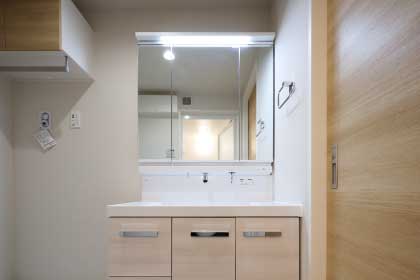 鏡の裏側には収納棚を確保。スキンケア用品やヘアケア用品などをすっきり整理できます。