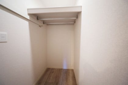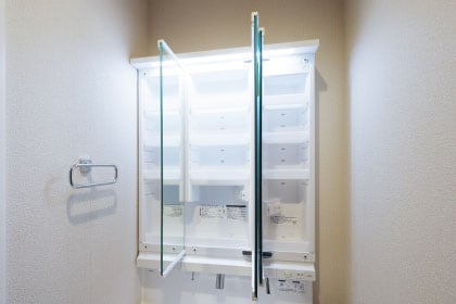 三面鏡の裏側には収納棚を確保。スキンケア用品やヘアケア用品などをすっきり整理できます。