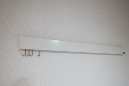 タオルや洗剤の収納に便利な吊戸棚の下にも、ハンガーがかけられるスペースを確保。