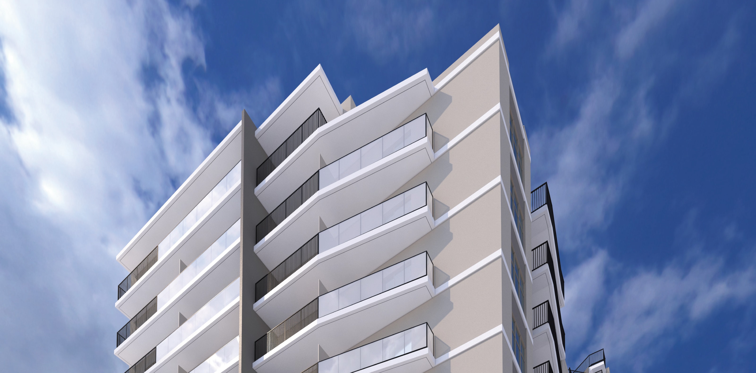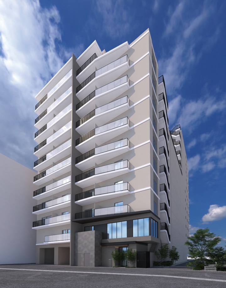 白系のタイルを基調としたシンプルな色合いの中に、アクセントとしてダークトーンのタイルを採用。 象徴的なセンターを縦に走るマリオンが印象的なフォルム。