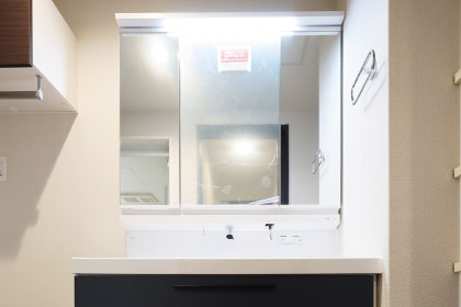 三面鏡の裏側には収納棚を確保。スキンケア用品やヘアケア用品などをすっきり整理できます。