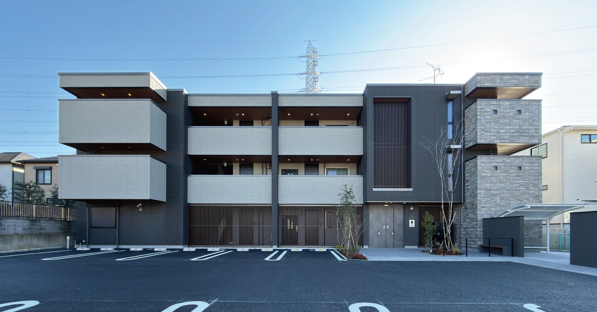 格子のスクリーンをアクセントに配した外観。